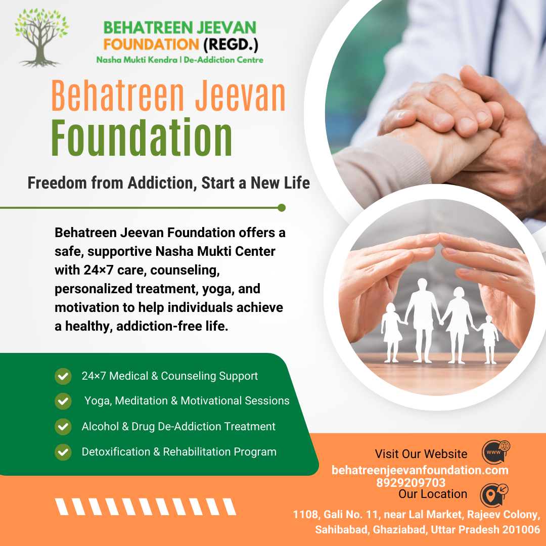 Behatreen Jeevan Foundation ka Nasha Mukti Kendra alcohol aur drug addiction se mukti ke liye professional treatment provide karta hai. Yahan expert doctors, counseling, detox, yoga aur positive environment ke through patients ko nayi shuruaat milti hai. Humara aim hai—har vyakti ko healthy aur nasha-mukt jeevan dena.